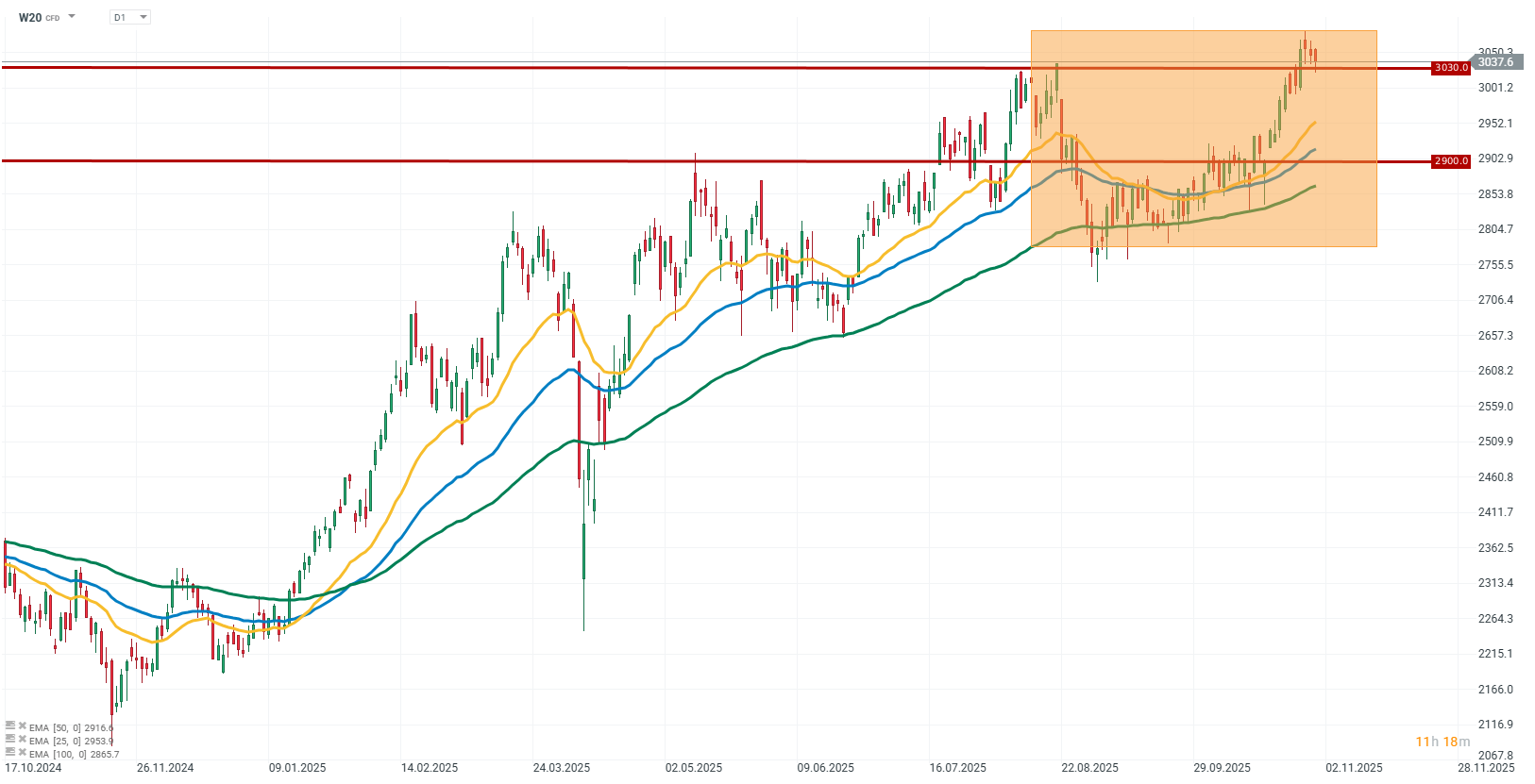 Koniec października nie sprzyja kontraktom na indeks WIG20. Notowania delikatnie cofają się względem poprzednich sesji, a przewagę sprzedających wzmacniają informacje napływające z banków centralnych Fed i ECB. Niemniej obserwujemy jedynie chwilową realizację zysków, ponieważ indeks cały czas pozostaje w silnym trendzie wzrostowym i utrzymuje się powyżej psychologicznej granicy 3000 punktów.