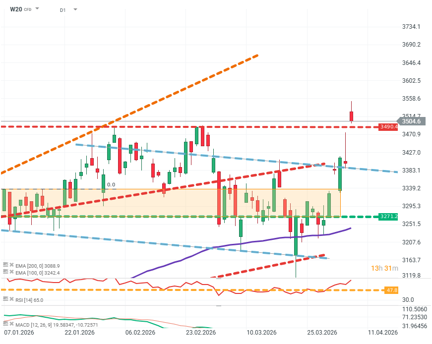 Kurs na wykresie z impetem przebił się przez strefę oporu na poziomie 3 500 punktów. Kupujący wydają się definitywnie przejmować inicjatywę, a na horyzoncie rysuje się scenariusz powrotu do wzrostów. Źródło: xStation5