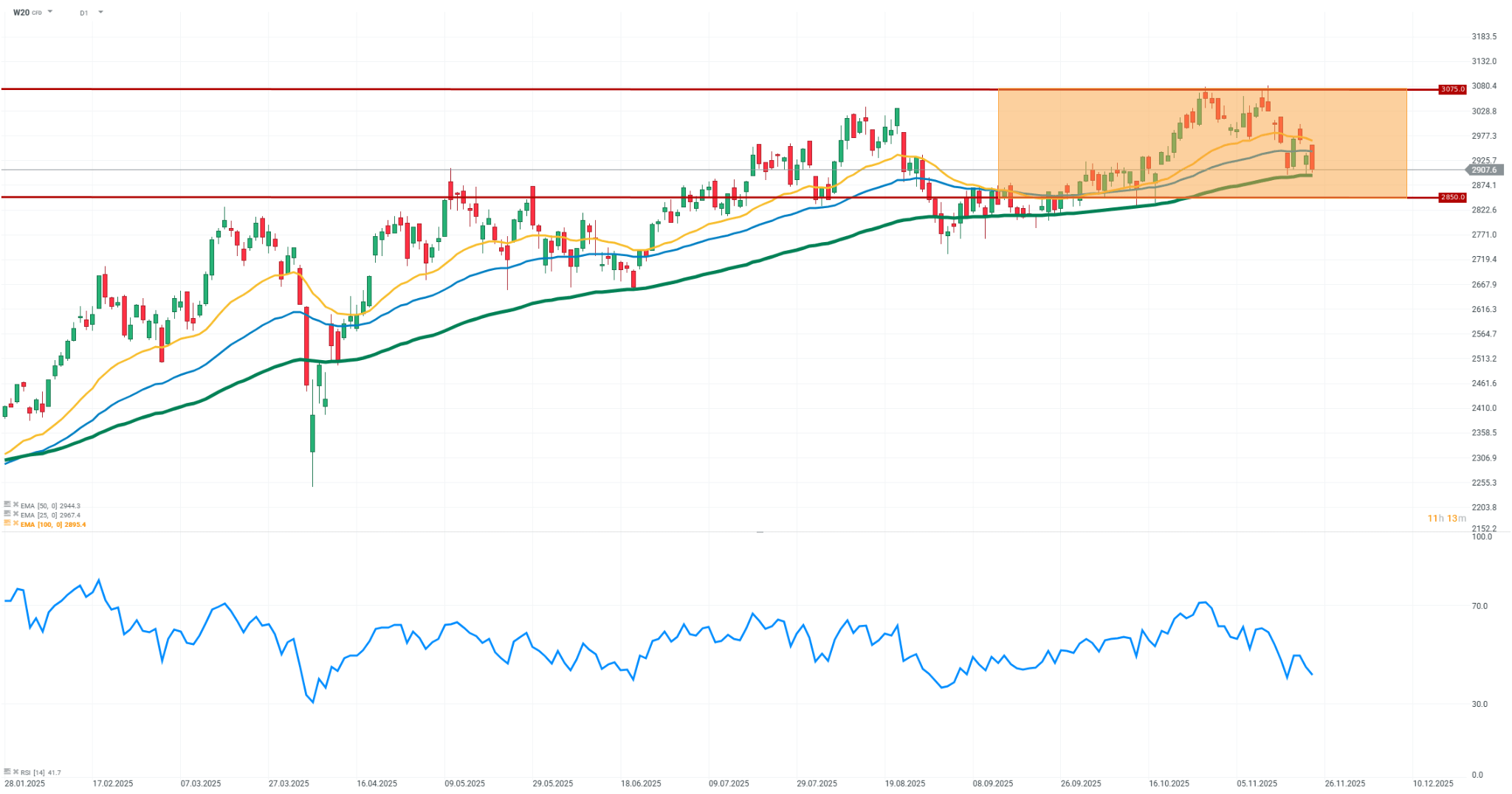 Z kolei dane z krajowego rynku pracy przyniosły rynkom negatywne zaskoczenie. Październikowy odczyt GUS pokazał wyraźne wyhamowanie dynamiki wynagrodzeń w sektorze przedsiębiorstw, która znajduje się obecnie na najniższym poziomie od blisko pięciu lat. Słabe tempo wzrostu płac wpisuje się w szerszy trend schładzania koniunktury. Firmy zgłaszają coraz mniej nowych procesów rekrutacyjnych oraz ostrożniej podchodzą do polityki wynagrodzeń. Dla rynku finansowego dane te mogą mieć mieszane konsekwencje. Z jednej strony wolniejsze tempo wzrostu płac ogranicza presję inflacyjną, co może wzmacniać argumenty za łagodniejszą polityką monetarną w nadchodzących kwartałach. Z drugiej strony słabnący rynek pracy sygnalizuje pogarszającą się kondycję popytu krajowego, co może przełożyć się na słabsze wyniki spółek operujących na rynku wewnętrznym.