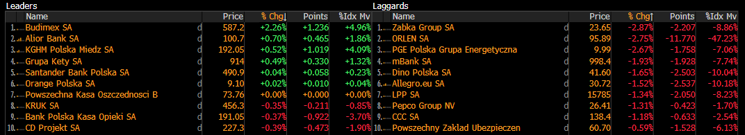 - Indeksy kontynuują spadki z poprzedniego tygodnia; WIG20 traci 0,6%, mWIG40 0,5%, sWIG80 0,2%