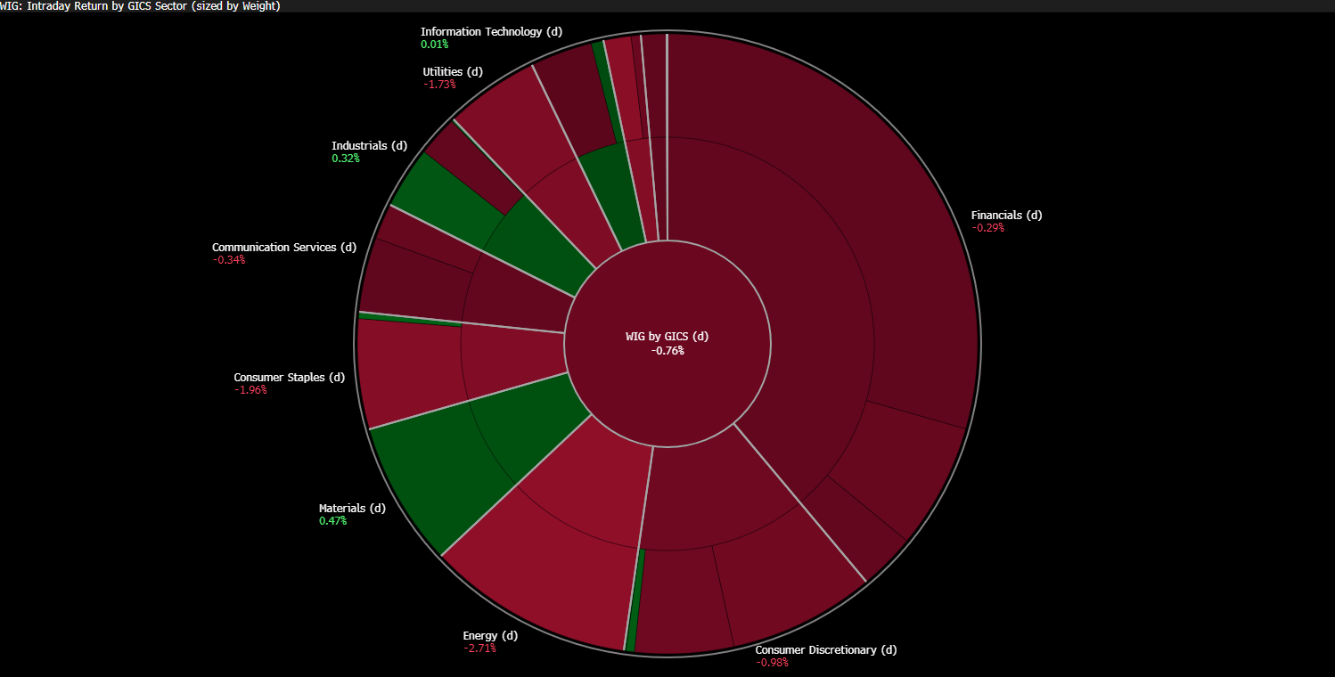 Na początku ostatniego tygodnia listopada polski parkiet kontynuuje spadki z poprzedniego tygodnia. O godzinie 12:50 indeks WIG20 notuje spadek o 0,6%, a szeroki indeks traci w tym momencie blisko 0,8%. Negatywny sentyment widoczny jest również w przypadku małych i średnich spółek. Indeksy mWIG40 i sWIG80 notują spadki odpowiednio o 0,5% oraz 0,2%..