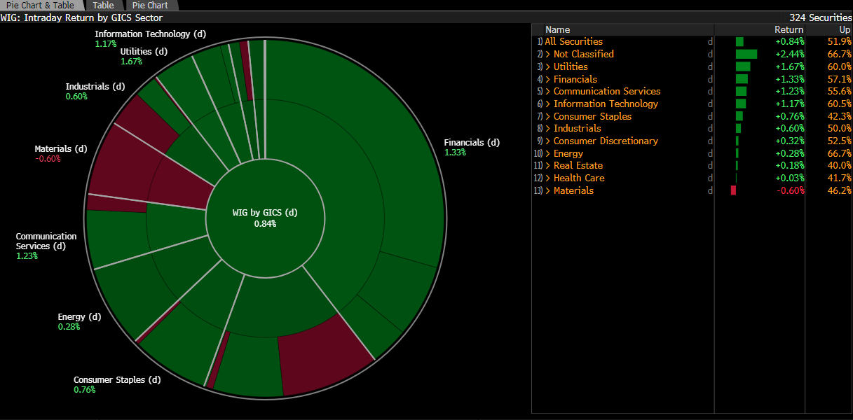 W przypadku szerokiego indeksu WIG widzimy wzrost o prawie 0,9%, a najmocniej rosnącymi sektorami są usługi użyteczności publicznej (+1,7%), finanse (+1,3%) oraz telekomunikacja (+1,2%).
