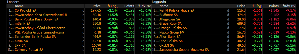 Nieco słabsze nastroje widać na indeksi WIG20, choć i tam dominuje zieleń. Cały indeks rośnie o ponad 0,6%, a wzrostom przewodzi CD Projekt zbliżający się do psychologicznej bariery 200 zł.