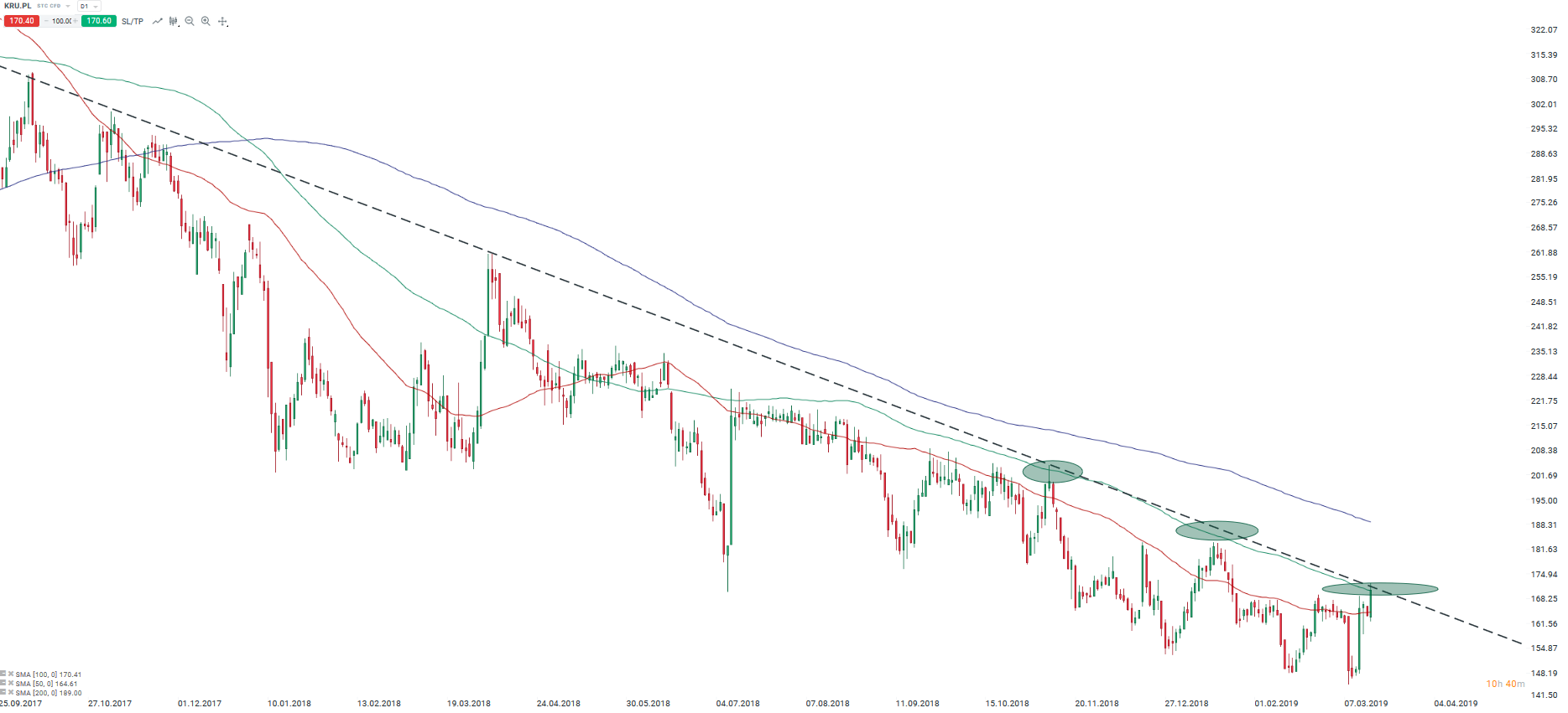 Kruk (KRU.PL) ponownie w ciekawej strefie (spadkowa linia trendu) oraz średnia 100-sesyjna. Źródło: xStation5.
