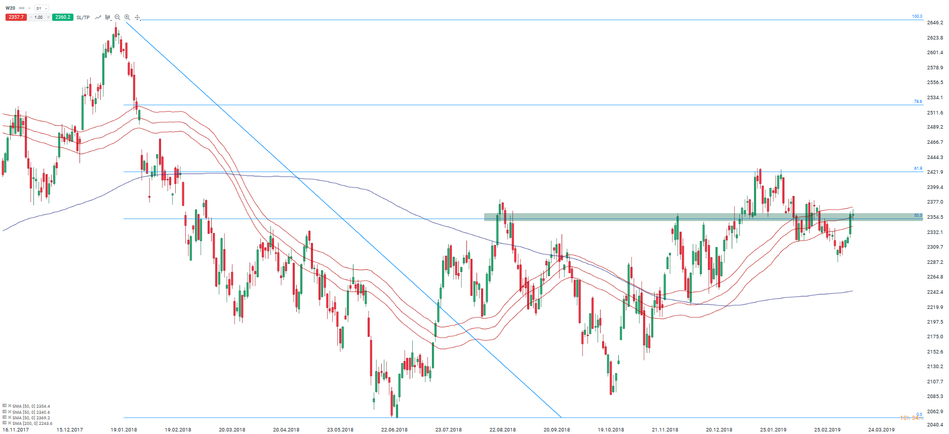 WIG20 (W20) ponownie wraca w rejon kanału średnich 50-okresowych. Źródło: xStation5.