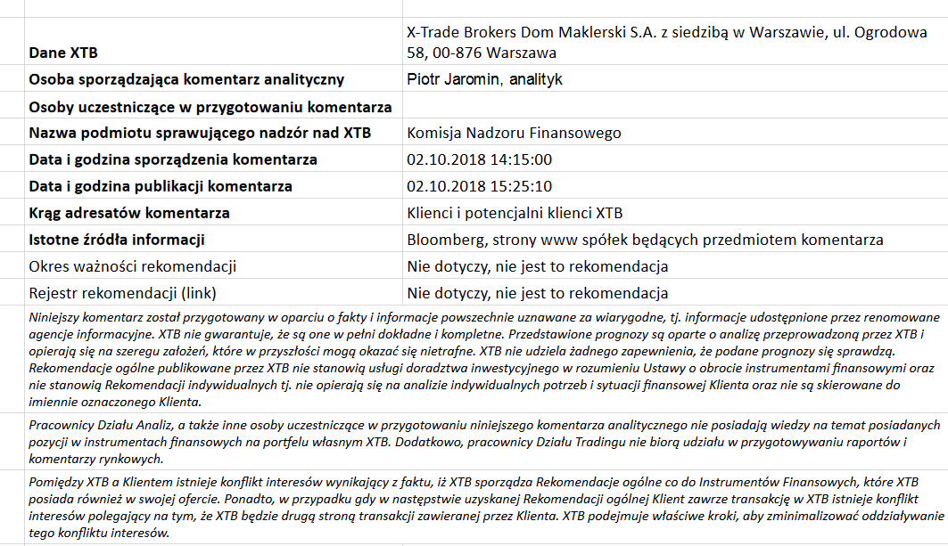 Regulamin sporządzania rekomendacji (link)Ta publikacja handlowa jest informacyjna i edukacyjna. Nie jest rekomendacją inwestycyjną ani informacją rekomendującą lub sugerującą strategię inwestycyjną. W materiale nie sugerujemy żadnej strategii inwestycyjnej ani nie świadczymy usługi doradztwa inwestycyjnego. Materiał nie uwzględnia indywidualnej sytuacji finansowej, potrzeb i celów inwestycyjnych klienta. Nie jest też ofertą sprzedaży ani subskrypcji. Nie jest zaproszeniem do nabycia, reklamą ani promocją jakichkolwiek instrumentów finansowych. Publikację handlową przygotowaliśmy starannie i obiektywnie. Przedstawiamy stan faktyczny znany autorom w chwili tworzenia dokumentu. Nie umieszczamy w nim żadnych elementów oceniających. Informacje i badania oparte na historycznych danych lub wynikach oraz prognozy nie stanowią pewnego wskaźnika na przyszłość. Nie odpowiadamy za Twoje działania lub zaniechania, zwłaszcza za to, że zdecydujesz się nabyć lub zbyć instrumenty finansowe na podstawie informacji z tej publikacji handlowej. Nie odpowiadamy też za szkody, które mogą wynikać z bezpośredniego czy też pośredniego wykorzystania tych informacji. Inwestowanie jest ryzykowne. Inwestuj odpowiedzialnie.