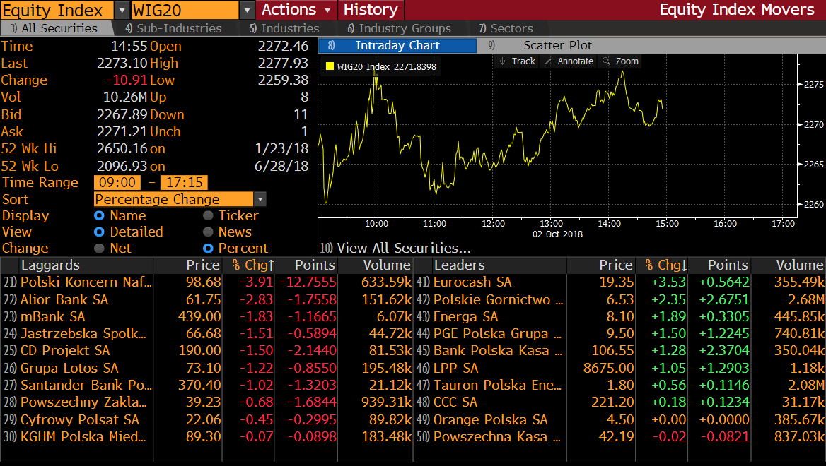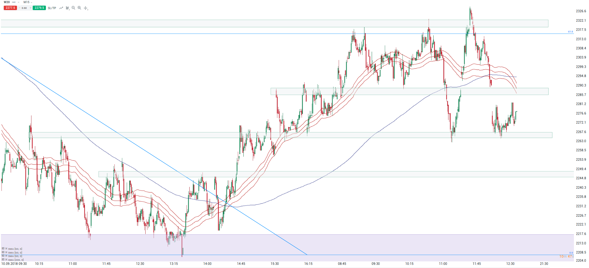 WIG20 (W20) w ostatnich dniach porusza się od bandy do bandy, pomiędzy poziomami 2265 a 2320 pkt. Na ten moment są to kluczowe poziomy, których wyłamanie powinno spowodować większe ruchy na indeksie polskich blue chipów. Pierwszą zaporą dla byków mogą być okolice 2285 pkt., gdzie znajdują się lokalne minima z ostatnich dni. Z kolei w przypadku pokonania 2265 pkt., większą aktywność byków prawdopodobnie zaobserwujemy dopiero w okolicach 2245 pkt., gdzie zlokalizowane są lokalne ekstrema z połowy września.