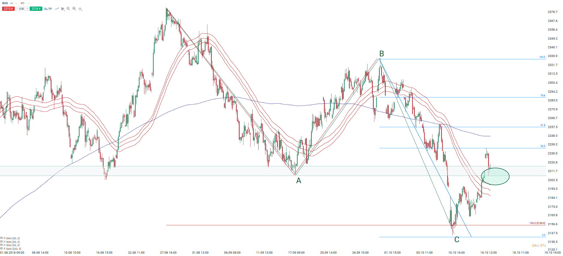 Na wykresie godzinowym kurs kontraktów na indeks WIG20 (W20 na xStation5) dotarł do zniesienia 50% ostatniej fali spadkowej (potencjalnej fali B). W tym miejscu o poranku obserwowaliśmy odpuszczenie popytu, a kurs kontraktów zakrył poranną lukę hossy i powrócił w rejon linii szyi dużej formacji RGR na wykresie dziennym. Warto jednak odnotować, że spadek od szczytów z końcówki sierpnia przybrał formę korekty ABC (równość fal A i C). Jeśli wzrosty będa kontynuowane, to kolejnym poziomem oporowym powinny być okolice 2258 pkt., gdzie znajduje się zniesienie 61,8% oraz lokalne szczyty z 10 października.