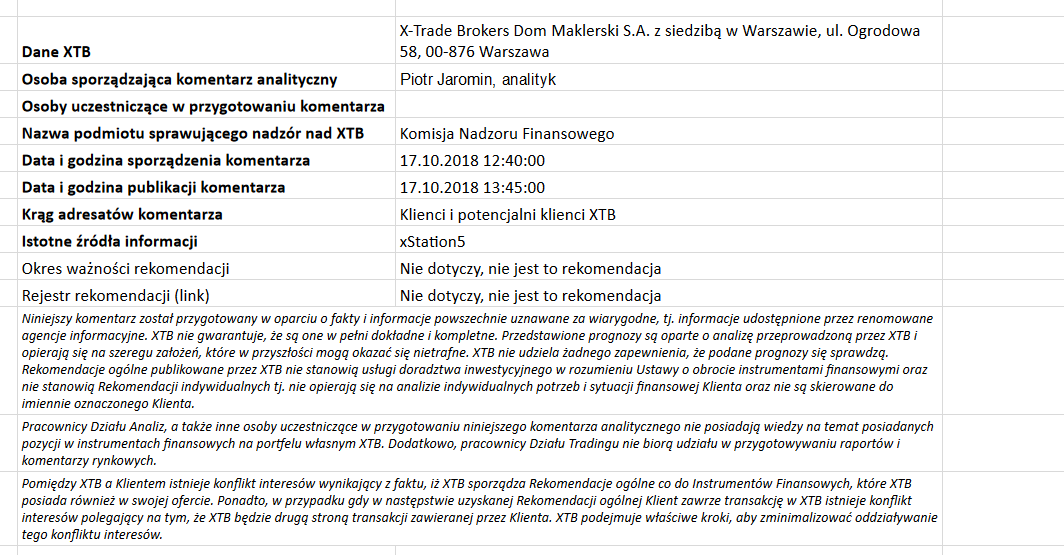 Ta publikacja handlowa jest informacyjna i edukacyjna. Nie jest rekomendacją inwestycyjną ani informacją rekomendującą lub sugerującą strategię inwestycyjną. W materiale nie sugerujemy żadnej strategii inwestycyjnej ani nie świadczymy usługi doradztwa inwestycyjnego. Materiał nie uwzględnia indywidualnej sytuacji finansowej, potrzeb i celów inwestycyjnych klienta. Nie jest też ofertą sprzedaży ani subskrypcji. Nie jest zaproszeniem do nabycia, reklamą ani promocją jakichkolwiek instrumentów finansowych. Publikację handlową przygotowaliśmy starannie i obiektywnie. Przedstawiamy stan faktyczny znany autorom w chwili tworzenia dokumentu. Nie umieszczamy w nim żadnych elementów oceniających. Informacje i badania oparte na historycznych danych lub wynikach oraz prognozy nie stanowią pewnego wskaźnika na przyszłość. Nie odpowiadamy za Twoje działania lub zaniechania, zwłaszcza za to, że zdecydujesz się nabyć lub zbyć instrumenty finansowe na podstawie informacji z tej publikacji handlowej. Nie odpowiadamy też za szkody, które mogą wynikać z bezpośredniego czy też pośredniego wykorzystania tych informacji. Inwestowanie jest ryzykowne. Inwestuj odpowiedzialnie.