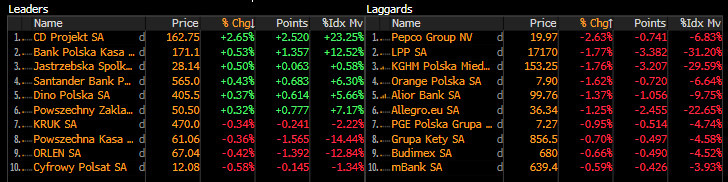 Początek tygodnia w przypadku warszawskiego rynku przebiega w otoczeniu spadkowym. W spadkach przewodzi sWIG80, który traci dziś ok. 0,8%. Szeroki indeks WIG traci dziś 0,4%, a WIG20 traci 0,3%. Najmocniejszą spółką w indeksie polskich blue-chipów jest CD Projekt, który rośnie dziś do nowych tegorocznych maksimów. Spółce brakuje 2,5% do osiągnięcia maksimów z lipca poprzedniego roku. CD Projekt w ostatnich dniach nie wypuścił żadnej istotnej informacji, która mogłaby drastycznie zmienić nastawienie do spółki, stąd wzrosty wydają się kontynuować wobec pozytywnego nastawienia inwestorów do postępujących prac nad kluczowymi tytułami spółki, które nadal są we wczesnym etapie.