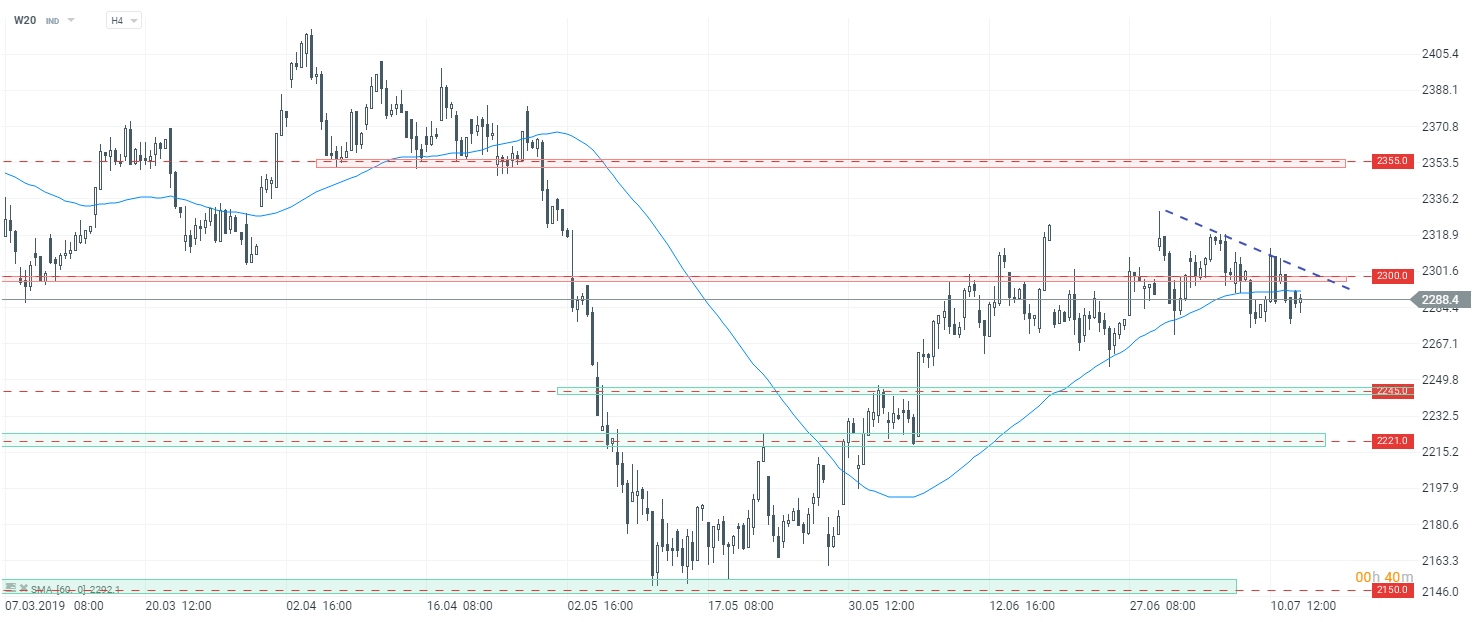 Dzisiejszy dzień na GPW jest mieszany, nie widać przewagi ani popytu ani podażu, Najlepiej w piątek radzi sobie sWIG80, który rośnie 0,66%. Inne indeksy utrzymują się na niewielkim plusie. WIG20 rośnie 0,10%, podobnie jak WIG30, który notuje +0,12%. Nieco większe wzrosty widać na mWIG40 (+0,15). Z kolei WIG znajduje się zaledwie 0,03% nad kreską. Patrząc techniczne na indeks WIG20 (W20) kurs porusza się w konsolidacji. Scenariusze wyznaczone we wczorajszej analizie pozostają więc aktualne. Dopóki nie zobaczymy bardziej zdecydowanego ruchu w jedną ze stron, obowiązuje tendencja boczna. Większe momentum wzrostowe może pojawić w momencie pokonania poziomu 2300 pkt, który grupuje się z przerywaną linią, która jest poprowadzona po ostatnich lokalnych szczytach. W przypadku takiego scenariuszem kolejny opór znajduje się dopiero przy 2355 pkt. Z kolei w przypadku scenariusza spadkowego, należy brać pod uwagę wsparcie przy 2245 pkt.