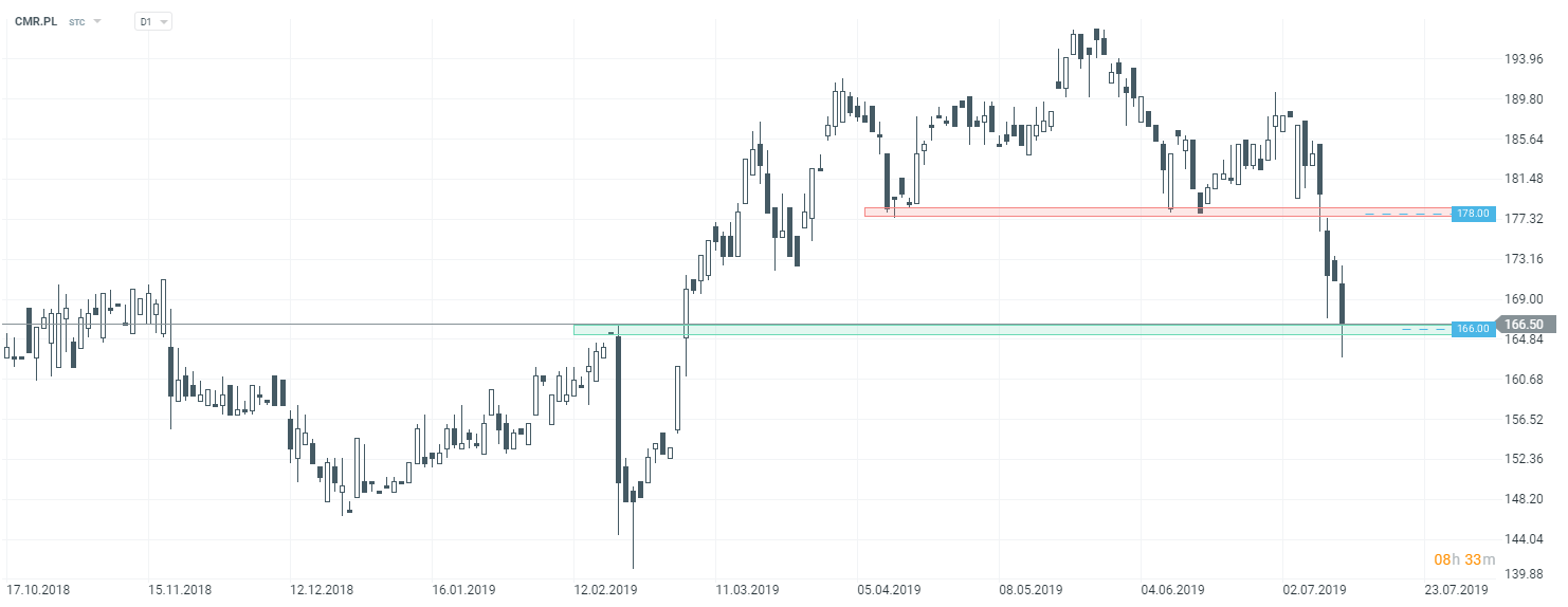Jeśli chodzi natomiast o najsłabiej radzące sobie spółki, warto przyjżeć się Comarchowi, który dziś zniżkuje ponad 2%. Cena zgodnie z ostatnią analizą realizuje formację głowy z ramionami (RGR). Pomimo sporych spadków, widać pierwszą reakcję popytu na wsparciu przy 166 zł za jedną akcję. Jeśli dzisiejsza sesja zamknie się poniżej, droga do dalszej przeceny będzie otwarta. W przeciwnym razie, jest do dobre miejsce do wykonania korekty wzrostowej. Trend pozostaje jednak spadkowy,a by mówić o jego zmianie, kurs musiałby wyjść powyżej poziomu oporu przy 178 zł, gdzie znajduje się strefa linii szyi, wspomnianej formacji RGR.