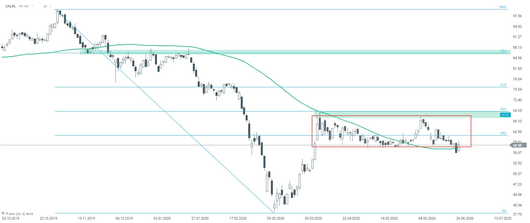 W dzisiejszej analizie przyjrzymy się sytuacji technicznej na spółce Lotos (LTS.PL), która jest liderem wzrostów wśród blue chipów, na poniedziałkowej sesji obserwujemy ponad 4% wzrosty. Dzisiejszy ruch w górę zawdzięczamy doniesieniom Reutersa, który poinformował, że Komisja Europejska wyda zgodę na przejęcie spółki przez Orlen. Proces przejęcia Lotosu wchodzi więc w kluczową fazę. KE ma czas na ostateczną decyzję do 15 lipca tego roku. Patrząc z kolei na sytuację techniczną, pod koniec tygodnia doszło do wybicia dołem z lokalnej konsolidacji. Niemniej dzisiejsze wzrosty mogą oznaczać że wybicie, z którym mieliśmy do czynienia w ostatni piątek okaże się fałszywe. Kluczowe dla kupujących powinno być utrzymanie dolnego ograniczenia boxa, który został zaczynamy na poniższym wykresie kolorem czerwonym. W przypadku takiego scenariusza, możliwy będzie ruch w kierunku oporu przy 68 zł.