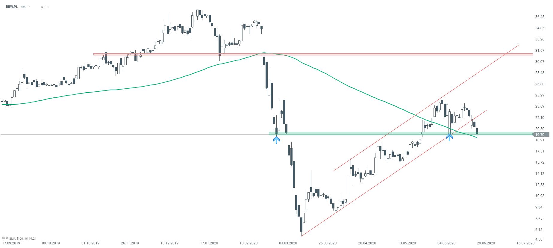 RBW.PL testuje kluczowe wsparcie wynikające z wcześniejszych reakcji cenowych przy poziomie 19,70 zł. Źródło: xStation5