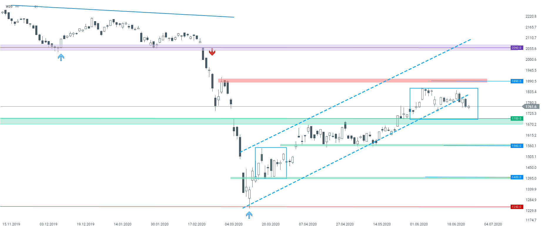 Jeśli chodzi z kolei o sytuację techniczną na indeksie dwudziestu największych spółek - WIG20 (W20), horyzontalne poziomy wsparcia i oporu pozostają bez zmian. Patrząc na wykres D1, pod koniec tygodnia doszło do wybicia dołem linii trendu poprowadzonej po ostatnich dołkach, co może przemawiać za kontynuacją ruchu w kierunku wsparcia. Ważnym wsparciem pozostaje wciąż strefa przy poziomie 1700 pkt. Miejsce to wynika z wcześniejszych reakcji cenowych,oraz dolnego ograniczenia układu 1:1, który jest największą korektą na fali wzrostowej, trwającej od 16 marca. Dopóki kurs znajduje się powyżej, w średnim terminie obowiązuje tendencja wzrostowa. Niemniej w przypadku gdyby doszło do wybicia dołem poziomu 1700 pkt, spadki mogą przybrać na sile. Oporem pozostaje z kolei strefa przy 1890 pkt.