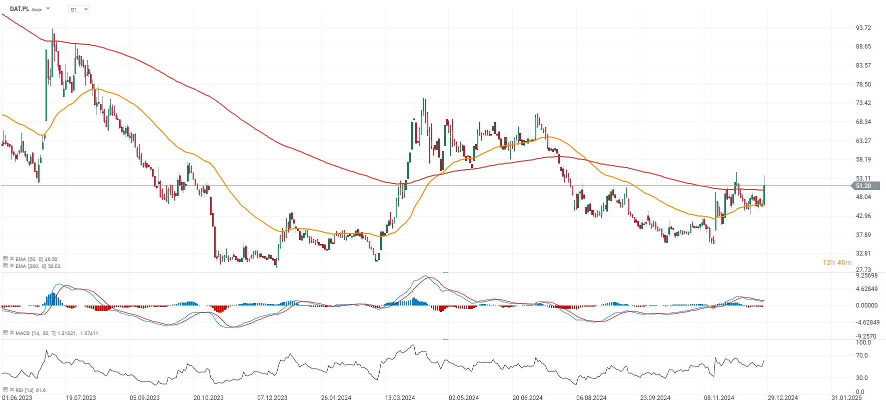 Akcje Datawalk kolejny raz przebiły się dziś powyżej EMA200 i próbują odwrócić trend spadkowy. Główny opór to okolice 65 - 70 PLN za walor (strefa dystrybucji).