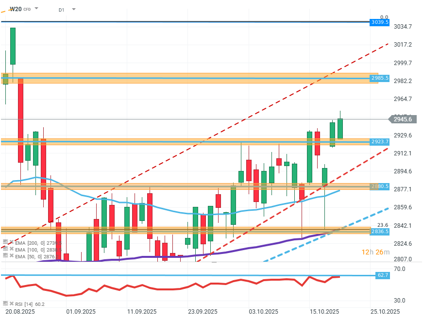 Cena na wykresie utrzymuje się powyżej poziomu wsparcia na 2920, co wskazuje na relatywną siłę kupujących. Kurs utrzymuje się w środku kanału wzrostowego, bazowym scenariuszem dla kupujących jest obecnie test oporu na 2980. Jeśli sprzedający chcą przejąć inicjatywę, konieczne jest sprowadzenie kursu poniżej kluczowego wsparcia na 2920 i dalej 2880. Wspierać ich w tym może rosnący wskaźnik RSI.