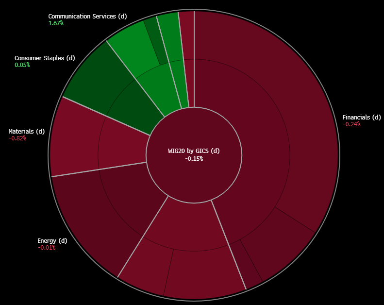 - WIG20 otwiera się w okolicach poprzedniego zamknięcia, rozpoczyna małym wzrostem jednak z czasem traci