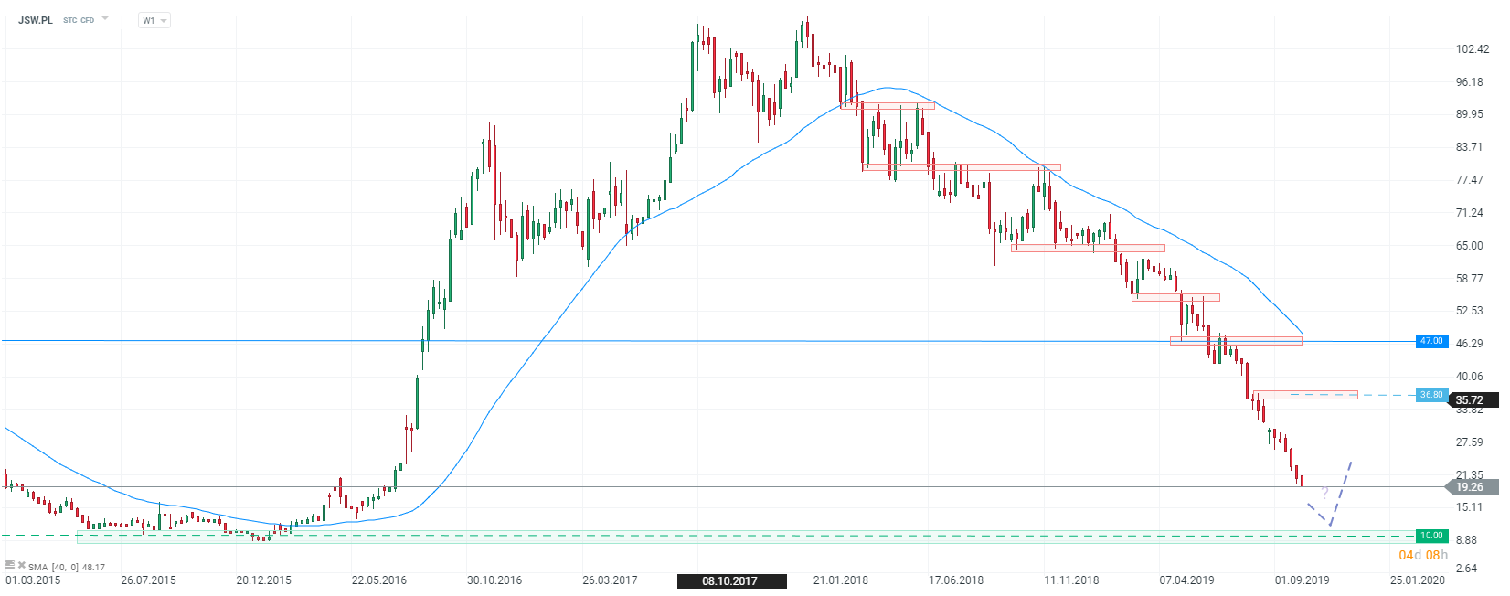 Jedną z najgorzej radzących sobie dziś spółek jest JSW. Jastrzębska Spółka Węglowa znajduje się we wtorek na minusie wynoszącym ponad 4%, tym samym kurs ponownie osiąga najniższe poziomy w tym roku. Patrząc na wykres brakuje jakiegokolwiek punktu zaczepienia. Przyjrzyjmy się więc sytuacji na interwale W1, gdzie od dłuższego czasu dominują sprzedający. Pomimo, że do minimów z 2016 roku brakuje blisko 10zł, czyli spółka musiałaby się przecenić jeszcze o 50%, jest to jedyny racjonalny poziom, który należy wziąć pod uwagę. Dlatego też podtrzymujemy zdanie, że jedynym słusznym scenariuszem wydaje się wuch właśnie w kierunku poziomu 10 złotych. Niemniej z racji braku jakichkolwiek większych korekt w ostatnim czasie, dołączenie do trendu jest trudne. Korekta wzrostowa może co prawda pojawić się niespodziewanie w każdej chwili, niemniej na razie brakuje jakichkowliek sygnałów do wzrostów, kurs tonie.