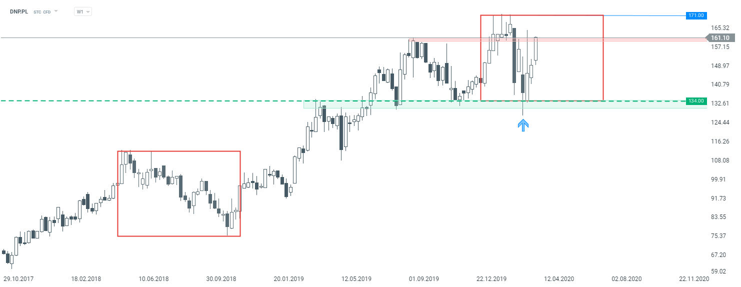 Najlepiej radzącą sobie dziś spółką wśród blue chipów jest Dino Polska, gdzie obserwujemy ruch na ponad 6% w górę. Ograniczenia wprowadzone przez polski rząd nie odnoszą się do sklepów spożywczych, a te mają się dobrze. Dlatego też ostatnie cofnięcie jest prawdopodobnie wykorzystywane przez kupujących do zwiększania ilości akcji. Patrząc na technicznie na interwał tygodniowy możemy zauważyć że notowania odbiły się od kluczowego wsparcia przy 134 złotych. Miejsce to wynikało z dolnego ograniczenia szerokiego układu Overbalance oraz wcześniejszych reakcji cenowych. Zgodnie z założeniami AT, tak długo ja kursznajduje się powyżej, obowiązuje tendencja wzrostowa.