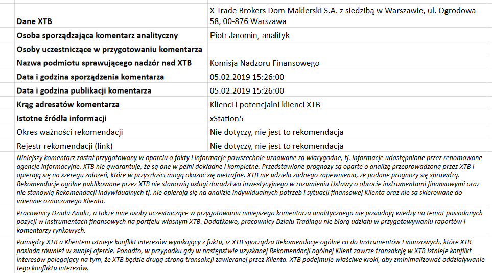 Ta publikacja handlowa jest informacyjna i edukacyjna. Nie jest rekomendacją inwestycyjną ani informacją rekomendującą lub sugerującą strategię inwestycyjną. W materiale nie sugerujemy żadnej strategii inwestycyjnej ani nie świadczymy usługi doradztwa inwestycyjnego. Materiał nie uwzględnia indywidualnej sytuacji finansowej, potrzeb i celów inwestycyjnych klienta. Nie jest też ofertą sprzedaży ani subskrypcji. Nie jest zaproszeniem do nabycia, reklamą ani promocją jakichkolwiek instrumentów finansowych. Publikację handlową przygotowaliśmy starannie i obiektywnie. Przedstawiamy stan faktyczny znany autorom w chwili tworzenia dokumentu. Nie umieszczamy w nim żadnych elementów oceniających. Informacje i badania oparte na historycznych danych lub wynikach oraz prognozy nie stanowią pewnego wskaźnika na przyszłość. Nie odpowiadamy za Twoje działania lub zaniechania, zwłaszcza za to, że zdecydujesz się nabyć lub zbyć instrumenty finansowe na podstawie informacji z tej publikacji handlowej. Nie odpowiadamy też za szkody, które mogą wynikać z bezpośredniego czy też pośredniego wykorzystania tych informacji. Inwestowanie jest ryzykowne. Inwestuj odpowiedzialnie.