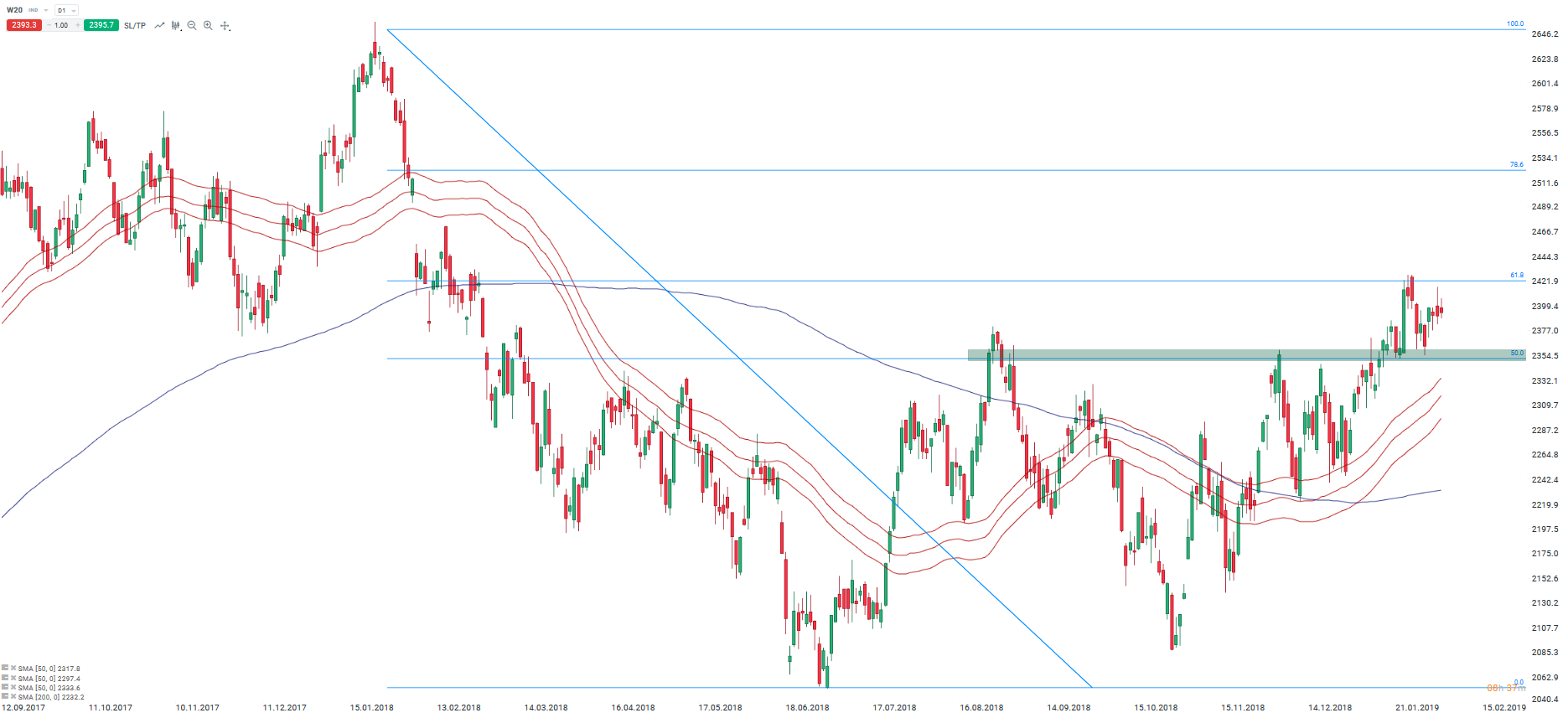 Indeks WIG20 (W20) cały czas pozostaje pod poziomem 2400 pkt. i zniesieniem 61,8% całej fali spadkowej z 2018 roku. Źródło: xStation5.
