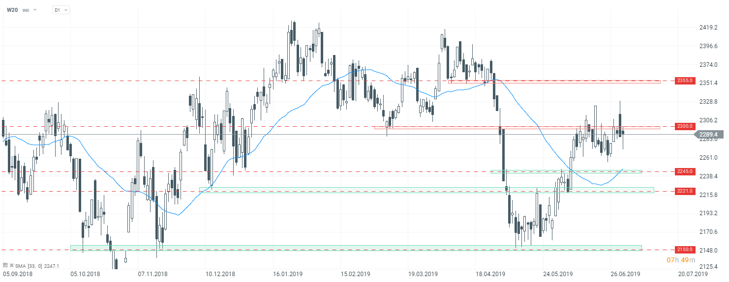 Sytuacja techniczna na indeksie W20 nie uległa zmianie. Wczoraj większość czasu cena utrzymywała się powyżej 2300 pkt, jednak ostatecznie sesja zamknęła się poniżej. W ostatnim czasie nie widać więc wyraźnego kierunku, kurs pozostaje w konsolidacji. Dopiero wyraźne pokonanie poziomu 2300 pkt, otworzy drogę do wzrostów, wtedy też należy brać pod uwagę opór przy 2355 pkt. W przeciwnym razie najbliższym wsparciem pozostają okolice 2245 pkt.