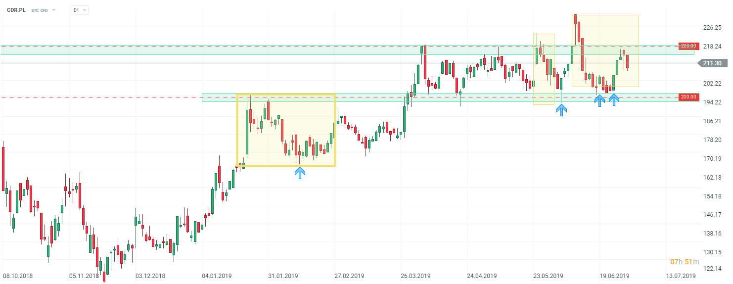 Spadki można dziś obserwować na spółce CD Projekt (CDR.pl). Ruch w dół jest konsekwencją nieudanej próby wybicia strefy oporowej przy poziomie 220 zł za akcję. Patrząc jednak z szerokiej perspektywy na wykres D1, cały czas znajdujemy się w trendzie wzrostowym, . ostatnie 3 ruchy korekcyjne byłby niemal identyczne, dlatego dopóki strefa przy poziomie 200 zł będzie broniona, należy oczekiwać dalszych wzrostów. Lokalnie możliwa jest konsolidacja, niemniej prawdopodobieństwo przemawia za wybiciem górą.