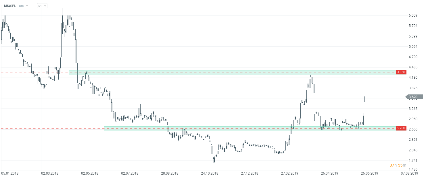 Sytuacja techniczna na spółce nie jest jednak dobra. Co prawda, tak duże wzrosty są oczywiście pozytywną informacją, niemniej główny trend jest spadkowy. Z perspektywy analizy technicznej, kluczowym oporem są dopiero okolice poziomu 4,35 zł, do którego jeszcze daleko. Wsparciem pozostaje strefa przy 2,7 zł.