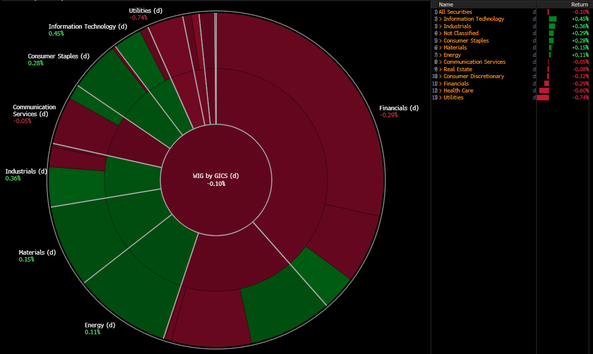 W ujęciu sektorowym najgorzej radzą sobie dziś na szerokim rynku spółki z sektora użyteczności publicznej, które tracą dziś 0,7%. Spadki widać także na notowaniach spółek z sektora opieki zdrowotnej (-0,6%), a także korektę po wczorajszych wzrostach notują banki i instytucje finansowe (-0,3%).
