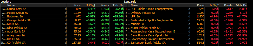 Polski rynek rozpoczął ostatnią sesję tygodnia z lekkimi spadkami. Najgorzej radzącym sobie głównym indeksem jest WIG20, który traci dziś prawie 0,3%. Na wynikach indeksu najbardziej ciąży PGE, które traci dzisiaj prawie 1,2%, a także Cyfrowy Polsat (-1%) oraz LPP (-0,9%). Po wczorajszej przecenie lekką poprawę widać natomiast na akcjach Budimexu, który zyskuje dziś prawie 1%.