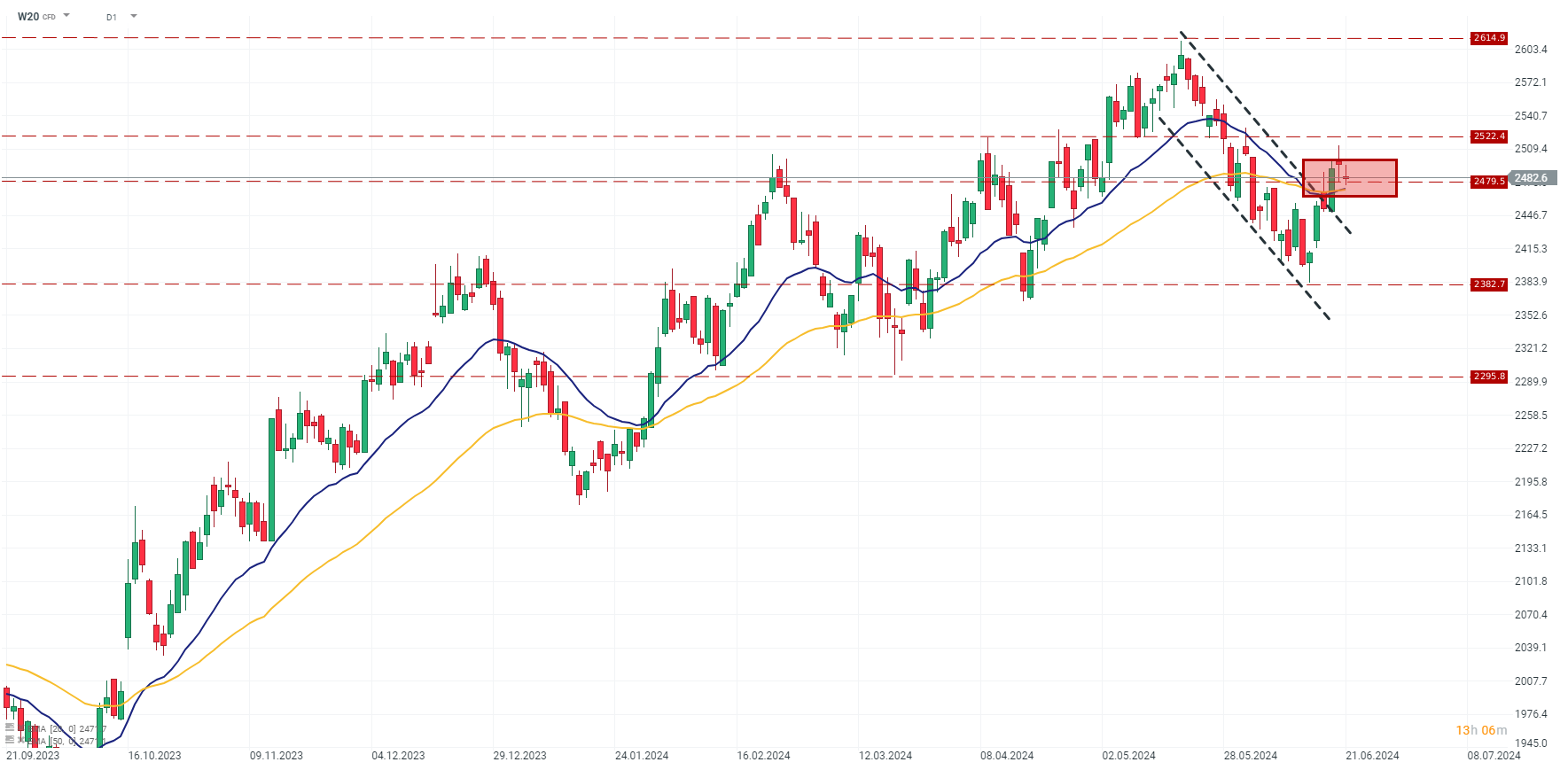 Kontrakt na indeks WIG20 (W20) w trakcie dzisiejszej sesji notuje lekki spadek. Byki walczą o utrzymanie przebicia poziomu 2479 pkt. co stanowi opór wyznaczony przez poziomy lokalnych szczytów z 2021 r. Brak dużych zmian w indeksie WIG20 (dziś przypada "Dzień Trzech Wiedźm" wraz z aktualizacją składu indeksów) pownien nie dostarczyć dodatkowej zmienności na notowaniach. Przebicie poziomu i utrzymanie się powyżej ograniczeń wąskiego kursu spadkowego rozpoczętego w połowie maja stanowi istotny sygnał mogący potwierdzić przesunięcie się notowań z korekty w stronę trendu bocznego lub w przypadku wzmocnienia popytu nawet do trendu wzrostowego. Kluczowym poziomem będzie 2522 pkt., które w ciągu tego roku stanowiły mocny opór i górne ograniczenie dla notowań kontraktu. Jeżeli jednak kontrakt powróci do ograniczeń trendu spadkowego potencjalne granice wsparcia wynoszą 2382,7 pkt., a kolejny 2295 pkt, choć przy obecnym otoczeniu rynkowym należałoby to traktować jako raczej pesymistyczny scenariusz. Źródło: xStation