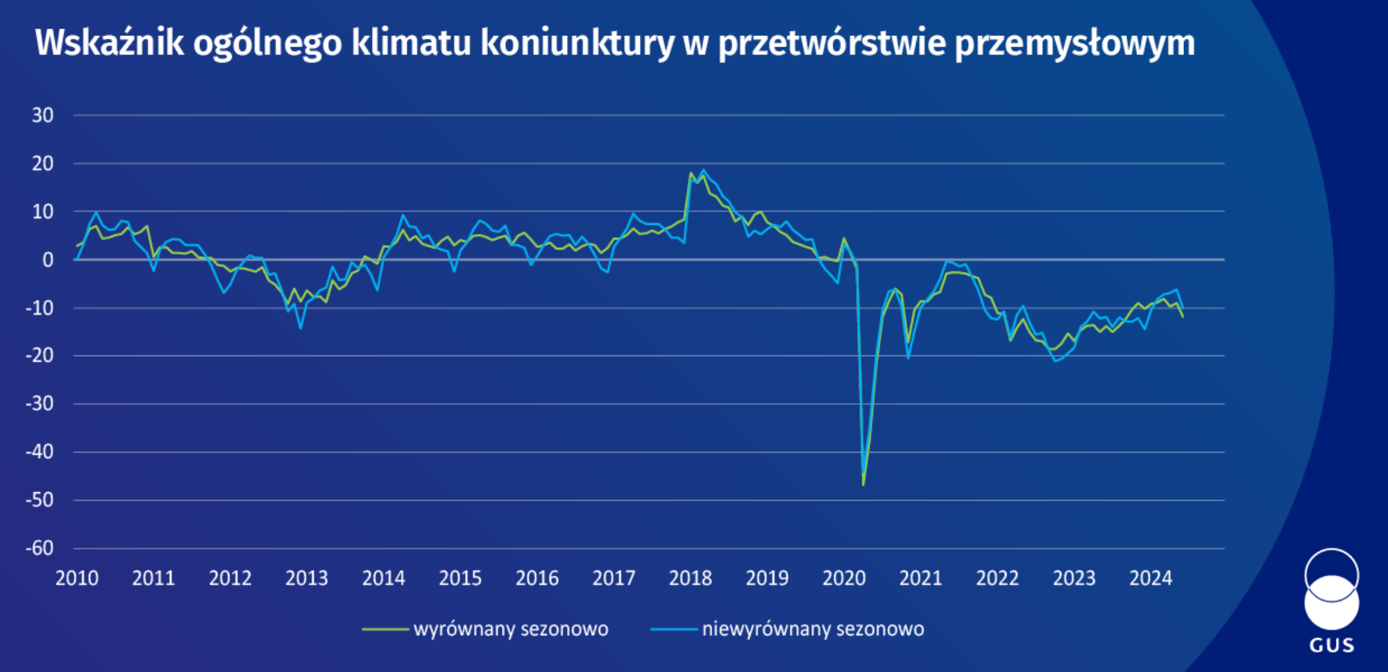 Wskaźniki klimatu ogólnej koniunktury za czerwiec publikowane przez GUS wskazują na lekkie pogorszenie się sytuacji w porównaniu do poprzedniego miesiąca. Najgorzej prezentuje się sektor przetwórstwa przemysłowego, którego wartość wskaźnika wyrównanego sezonowo spadła do -11,9 (wobec -9 w maju). Mocniejsze pogorszenie widać na wskaźniku niewyrównanym, którego wartość wyniosła -10,1 (wobec -6,2 za maj). Spadek oznacza przerwanie trendu poprawy wskaźnika widocznego od początku tego roku. Lekkie pogorszenie widać także w budownictwie, gdzie wskaźnik wyrównany sezonowo przyjął wartości -4,7 (wobec -4,6 za maj). Poprawę widać natomiast w sektorach Transportu i gospodarki magazynowej (-2,2 wobec -2,4 za maj) oraz Zakwaterowania i gastronomii (0,2 wobec -3 za maj).