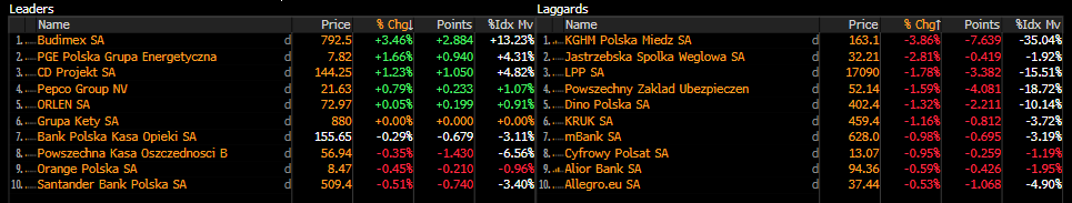 Polski rynek kontynuuje spadki z wczorajszego dnia. Dziś najgorzej radzącym sobie indeksem jest WIG20, który traci jak na razie prawie 0,8%. Wśród polskich “blue chipów” najmocniej rosnącą spółką jest Budimex (+3,5%), który dodatkowo zyskuje po poinformowaniu o nowym kontrakcie. Wzrosty kontynuuje także CD Projekt (+1,2%), a także PGE (+1,7%). Najgorzej radzącym sobie aktywem w indeksie jest KGHM, który traci dziś prawie 4% w obliczu realizacji zysków na miedzi i dalszych spadkach cen srebra.