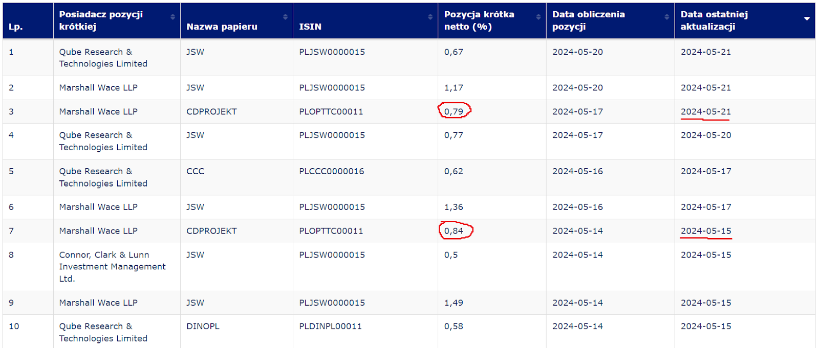 - Potężny skok zmienności obserwujemy dzisiaj na walorach CD Projekt (CDR.PL), które na początku sesji zyskiwały nawet 4.4%, po czym doszło do cofnięcia i skorygowania skali tych zwyżek do 1.2% (na moment publikacji tego raportu). Dokładny powód tych ruchów nie jest do końca znany, ale można go powiązać z redukcją pozycji krótkiej funduszy Marshall Wace.