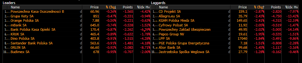 Dzisiejsza sesja rozpoczęta została mocnymi spadkami na wszystkich głównych indeksach polskiego rynku. Najmocniej traci najlepiej radzący sobie w poprzednich dniach WIG20, którego spadki sięgają dziś ponad 1,5%. W indeksie na moment publikacji tracą wszystkie spółki, z czego największe korekty widzimy na akcjach CD Projekt. Spółka zanotowała wczoraj rajd, prawie przebijając poziom 164 zł i zbliżyła się mocno do poziomów wsparcia z okolic okresu tuż przed premierą Widma Wolności. Dziś na akcjach spółki widzimy prawie 3% przecenę. Spadają również notowania KGHM, które podążają podobną trajektorią, co ceny miedzi.