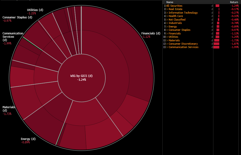 Indeks szerokiego rynku WIG traci dziś nieco ponad 1,2%. Wszystkie czołowe sektory ciążą dziś na rynkowej wycenie indeksu, a spadkom przede wszystkim przewodzi sektor telekomunikacji (-2%) oraz dóbr dyskrecjonalnych (-1,9%).