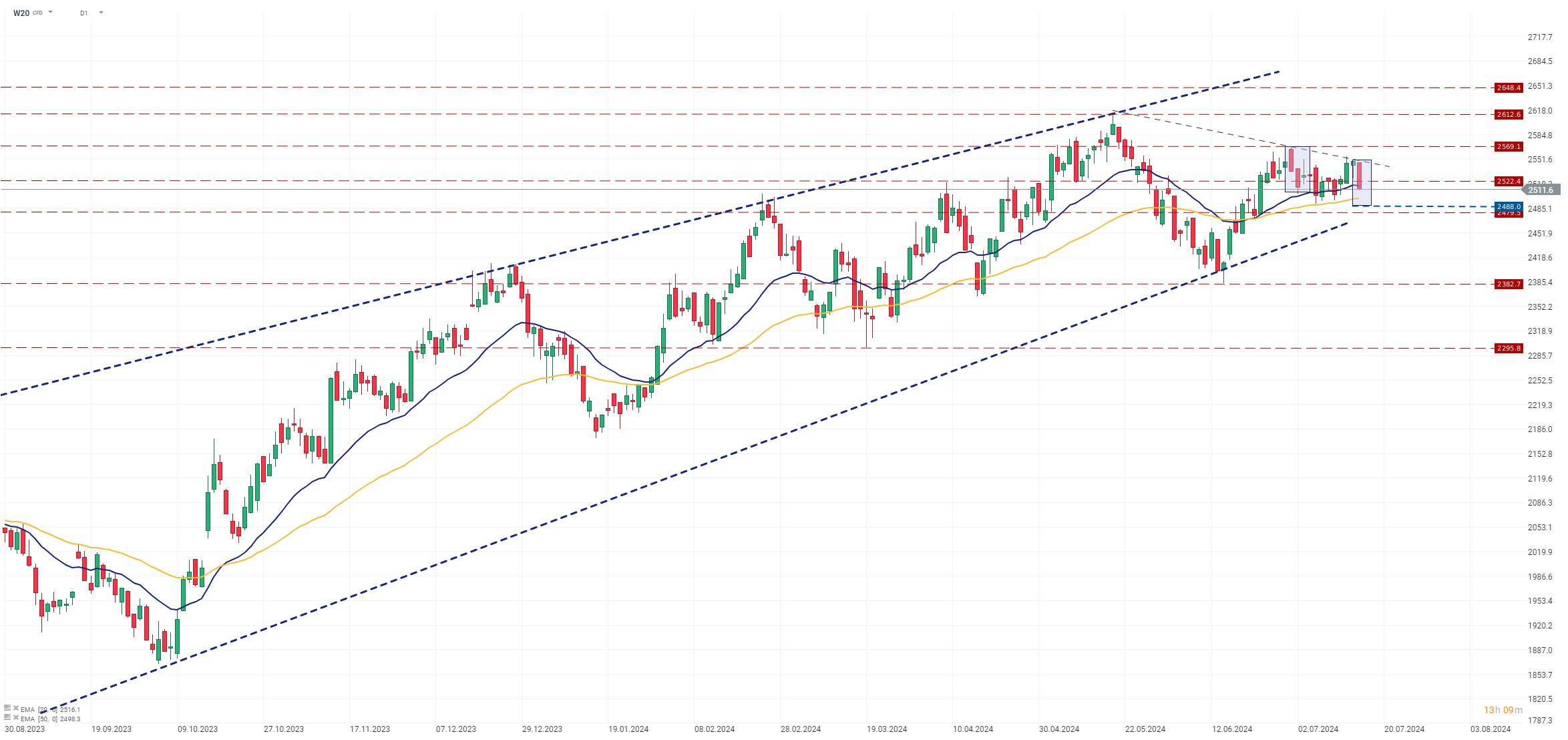 Umocniony opór na poziomie 2550 pkt odwrócił dziś notowania kontraktu na WIG20 (W20). W efekcie kontrakt spadł poniżej poziomu 2522 pkt, w okolicach którego kontrakt od początku lipca wchodzi w sferę konsolidacji. Prawdopodobny zasięg dziś zapoczątkowanej korekty może sięgać do poziomu 2488 pkt., patrząc na lokalną geometrię rynkową. Kontrakt przebił dziś także poziom wykładniczej średniej kroczącej EMA20, który może stanowić jeszcze w trakcie dzisiejszej sesji dodatkowe wsparcie, zmniejszające zakres koretky. W przypadku utrzymania przewagi podażowej docelowy najważniejszy punkt oporu znajduje się przy 2450 pkt., który wyznaczają z jednej strony poziomy z 2021 r., a także ograniczenie dolne trwającego od połowy zeszłego roku trendu wzrostowego. Źródło: xStation