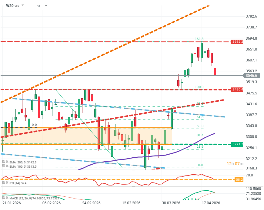 Kurs na wykresie kontynuuje spadek w kierunku dolnego ograniczenia kanału konsolidacji. Kluczowe dla strony popytowej jest utrzymanie poziomu ok. 3490 pkt. Na korzyść podaży może działać normalizacja wskaźnika RSI oraz spadkowe sygnały wskaźnika MACD. Jeśli sprzedającym udałoby się pokonać poziom 3490 pkt, otwiera to drogę do testu szerokiej strefy wsparcia w rejonie 3420–3380. Źródło: xStation5