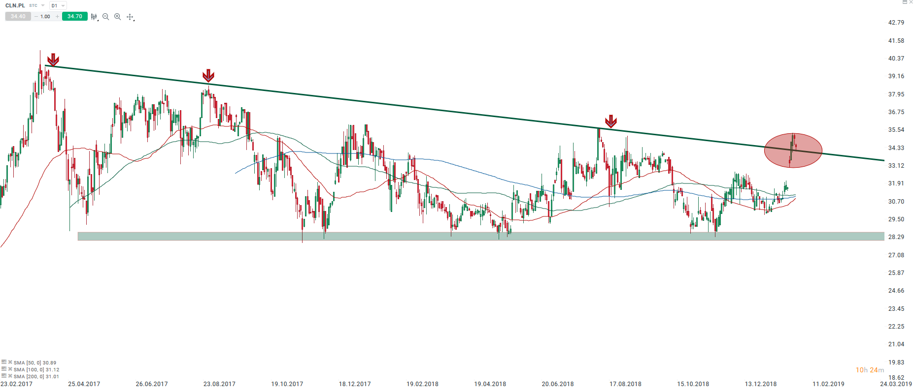 Celon Pharma w tym tygodniu mocno zyskiwała, co przyniosło jej wyjście górą z formacji trójkąta zniżkującego. Źródło: xStation5.