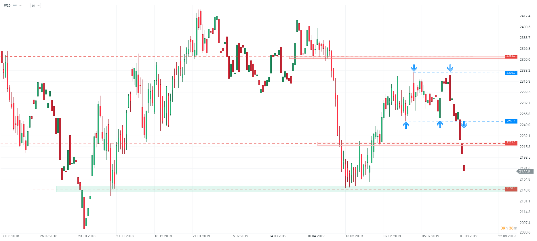 Podczas poniedziałkowej sesji możemy obserwować kontynuację spadków na światowym rynku akcji. Negatywne nastroje udzielają się także na polskiej giełdzie. WIG20 traci dziś 1,25%. Inne indeksy również znajdują się pod kreską, WIG30 traci 1,3%, a WIG 1,1%. Nieco poniżej 1% tracą dziś mWIG40 i sWIG80. Patrząc technicznie na W20, kurs zmierza w kierunku wsparcia przy poziomie 2150 pkt. Poziom 2220 pkt został bez większego problemu pokonany w ubiegłym tygodniu, teraz w przypadku korekty wzrostowej, może on działać jako opór. Sentyment jest wyraźnie negatywny, dlatego trzeba się wstrzymać z ewentualnymi zakupami. Dalsza eskalacja konfliktu na linii USA-Chiny może prowadzić do dalszych spadków na rynku akcji.
