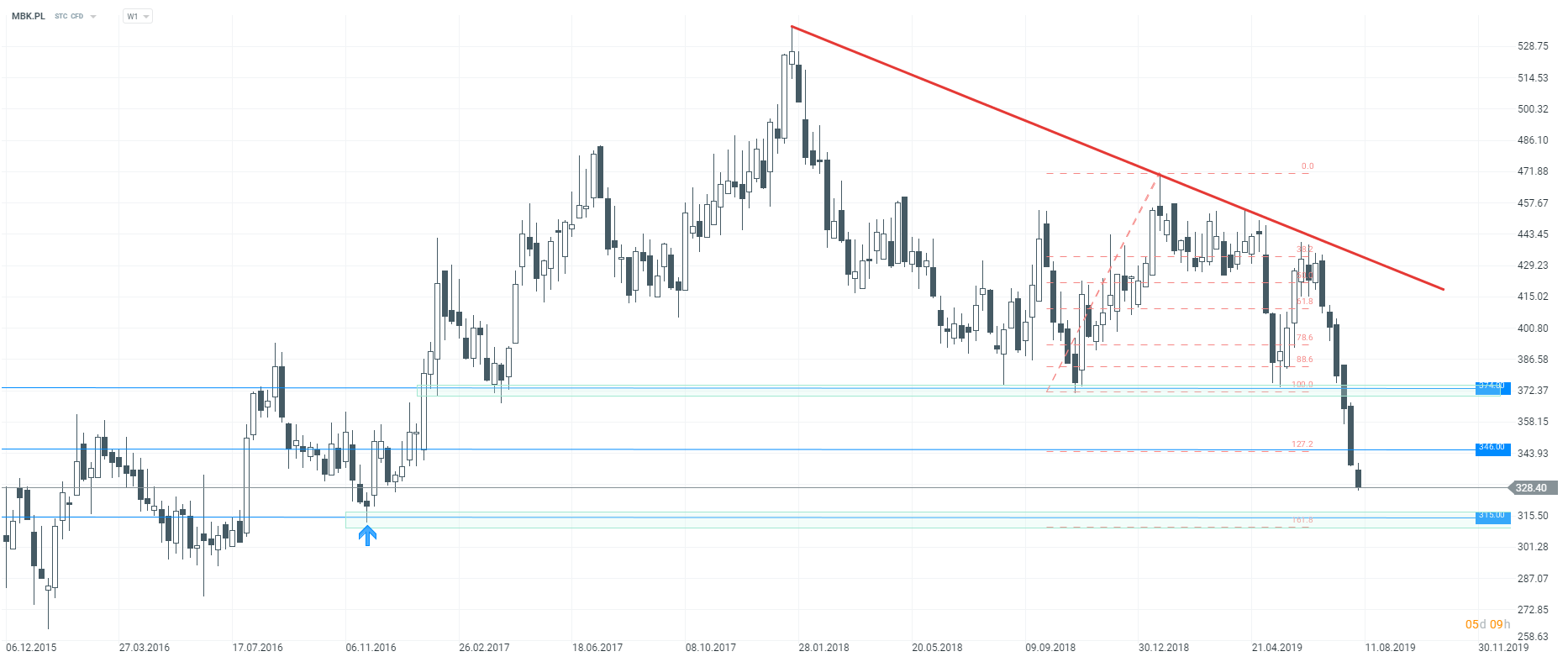 MBank (MBK.PL) traci nie tylko z powodu niedźwiedzich nastrojów na rynku akcji. Instytucja ma za sobą dość dużą “wpadkę”. Po aktualizacji systemu, klienci nie mogą zalogować się do swoich kont. Grożą, że wypowiedzą umowy “bo takie mają prawo”. Jeśli chodzi o sytuację techniczną, to w ubiegłym tygodniu zostało pokonane wsparcie wynikające z mierzenia 127,2% ostatniego ruchu wzrostowego. Tym samym droga do współczynnika 161,8% pozostała otwarta. Tendencja jest w ostatnim czasie wyraźnie spadkowa, dlatego szukanie dołka nie wydaje się dobrym pomysłem. Dodatkowo podczas tak silnych impulsów rośnie ryzyko wystąpienia gwałtownej korekty wzrostowej. W przypadku ruchu korekcyjnego, mierzenie 127,2% może działać jako opór.