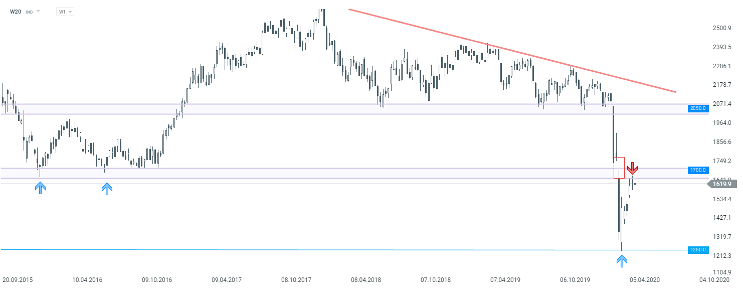 Jeśli chodzi natomiast o sytuację na wykresie WIG20 (W20), to na interwale tygodniowym, nie uległa ona większej zmianie. Pod koniec tygodnia pisaliśmy o tym że, broniona jest strefa oporowa przy poziomie 1700 pkt i ostatecznie świeca W1 zakończyła się niewielkim czarnym korpusem. Z jednej strony świadczy to o niezdecydowaniu, niemniej z drugiej - doszło do obrony kluczowego oporu, dlatego też dalszy ruch w dół jest możliwy. Zgodnie z klasycznymi założeniami analizy technicznej, tak długo jak notowania znajdują się poniżej wspomnianej strefy - obowiązuje tendencja spadkowa, a ostatni ruch w górę należy traktować jedynie jako dynamiczną korektę. Celem dla strony podażowej są ostatnie minima przy 1250 pkt.