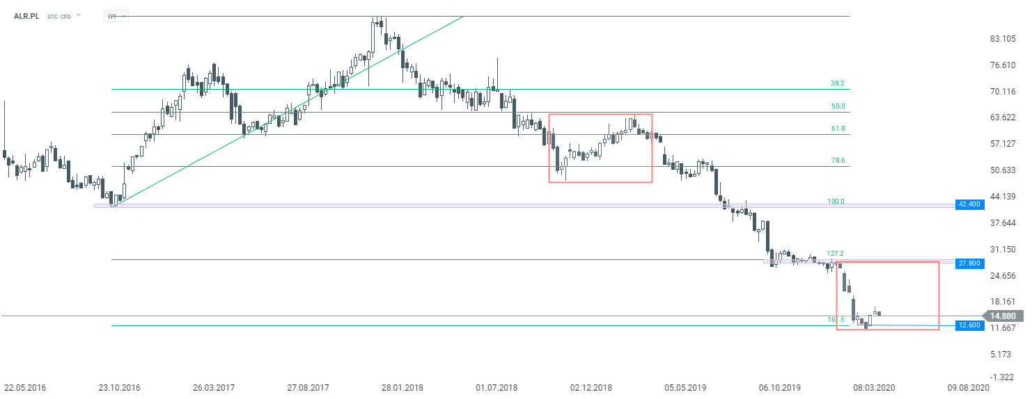 Najgorzej radzącą sobie dziś spółką wśród blue-chipów jest Alior Bank (ALR.PL), gdzie spadki zbliżają się do 5%. Patrząc technicznie na wykres tygodniowy, sytuacja nie wygląda najlepiej. Co prawda ostatnie spadki wyhamowały na wysokości mierzenia zewnętrznego 161,8%, niemniej nie widać większego zainteresowania strony kupującej. Trend pozostaje silnie spadkowy, a w przypadku pokonania wspomnianego zniesienia Fibonacciego, ruch w dół może przyspieszyć. Aby myśleć o odwróceniu tendencji, notowania musiałyby w pierwszej kolejności wrócić powyżej 27,8 zł, który jak na razie wydaje się bardzo odległym poziomem.