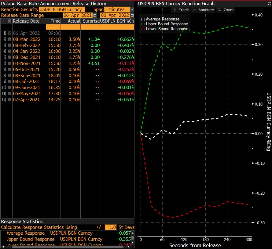 Rekacja pary USDPLN na jedną godzinę po publikacji decyzji RPP w sprawie podwyżki stóp. Źródło: Bloomberg