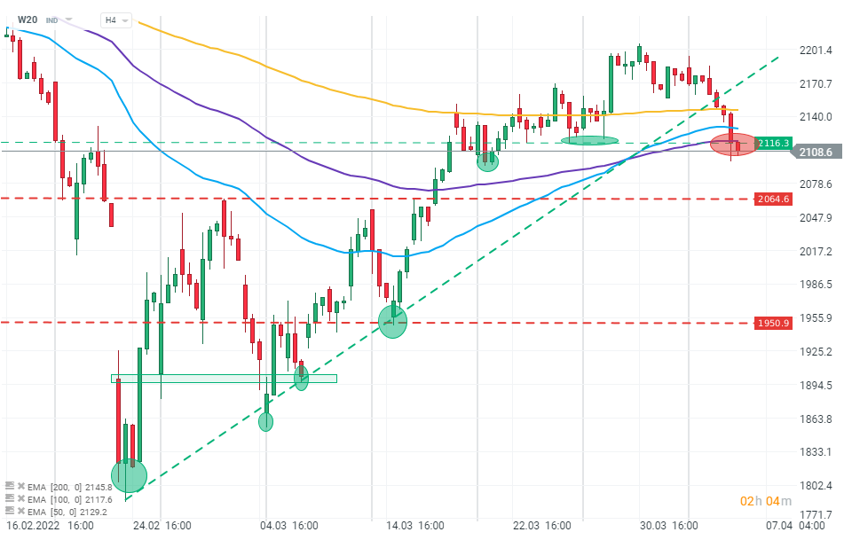 Wykres W20, interwał H4. Dzisiejsza sesja przyniosła wybicie poniżej ostatniego dołka w okolicach 2115 punktów, co może wskazywać na załamanie trwającego od lutego 2022 roku trendu wzrostowego. Z technicznego punktu widzenia, jeśli stronie popytu nie uda się zanegować obecnych zniżek, ruch spadkowy może przyspieszyć w kierunku poziomu 2060 punktów. Najbliższy, ważny opór znajduje się blisko 2120 punktów, gdzie przebiega 100 okresowa, wykładnicza średnia krocząca (fioletowa linia). Źródło: xStation 5