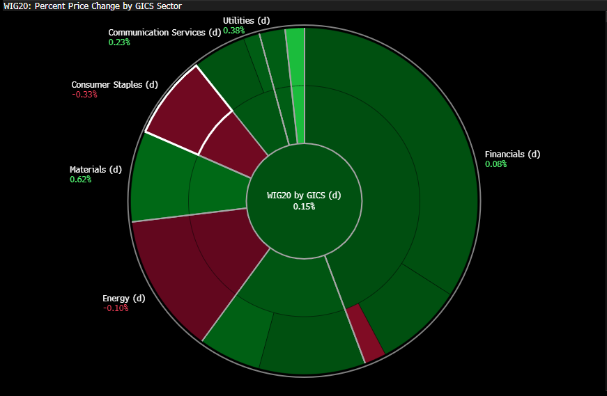 Nowy tydzień warszawski parkiet zaczyna od niewielkich plusów. Najważniejszy polski indeks WIG20 rośnie o ponad 0,1% względem poprzedniego tygodnia, podobnie jak mWIG40 który zyskuje blisko 0,5%. Jedynie indeks najmniejszych spółek nie radzi sobie z początkiem tygodnia i w tym momencie traci ponad 0,1%,