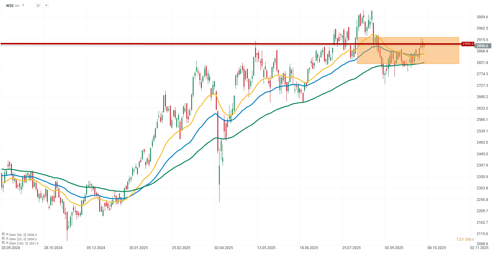 Pozytywna atmosfera na rynku utrzymuje się, a notowania indeksu WIG20 krążą wokół ważnego poziomu 2900 punktów. Przełamanie tego oporu może stać się mocnym impulsem do dalszych wzrostów i zapoczątkować ofensywę w kierunku psychologicznej bariery 3000 punktów. Obecne konsolidowanie się wokół tego pułapu wskazuje na gotowość rynku do zdecydowanego ruchu, a dalszy rozwój sytuacji będzie w dużej mierze zależał od siły popytu w najbliższych sesjach.