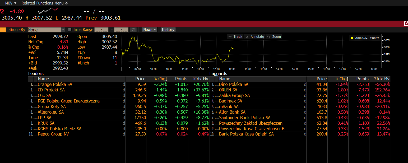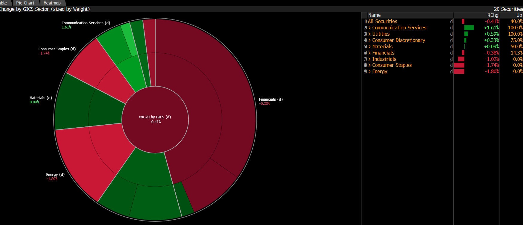 W indeksie WIG20 spadki dominują walory banków, energii i dóbr konsumenckich. Najmocniejszymi walorami są dzisiaj Orange, CDR i CCC, a tracą Dino, Orlen i Zabka Group.