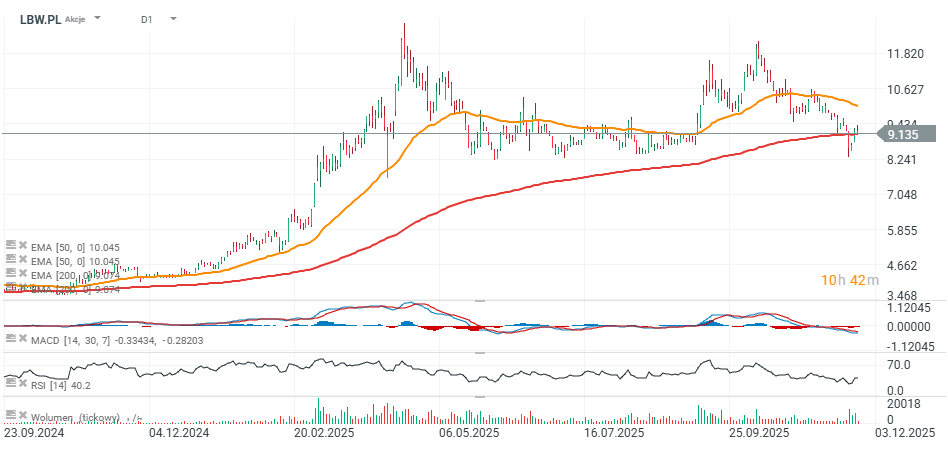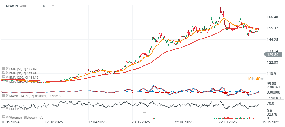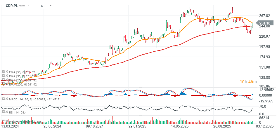 Reakcja rynku jest pozytywna, co odzwierciedlił wzrost notowań sięgający około trzech procent w trakcie sesji. Warto jednak zauważyć, że inwestorzy pozostają ostrożni, ponieważ spółka nie pokazała nowych sygnałów dotyczących kampanii marketingowej dla kolejnej dużej premiery. CD Projekt dysponuje obecnie solidną bazą finansową, lecz bez widocznej zapowiedzi istotnych wydarzeń produktowych trudno oczekiwać trwałego impulsu do przebicia obecnej wyceny. Patrząc na akcje CD Projektu, widzimy, że cena rośnie dziś o prawie 3% i testuje 50-sesyjną średnią kroczącą EMA50 (pomarańczowa linia).